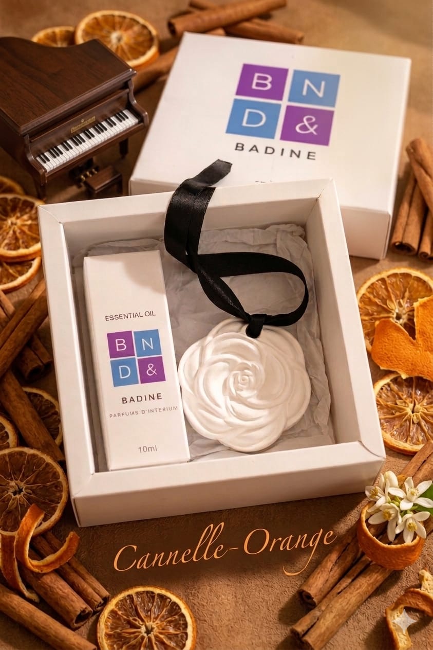 Présenté dans un coffret 4 pièces complet — fleur en plâtre, flacon 10 ml, ruban satin et écrin Badine — le plâtre parfumé Cannelle-Orange est un cadeau original, raffiné et inoubliable pour toutes les occasions.